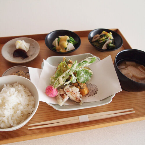 菜の花、蕾菜、うるいなど早春の味覚を盛り込んだ定食でも、